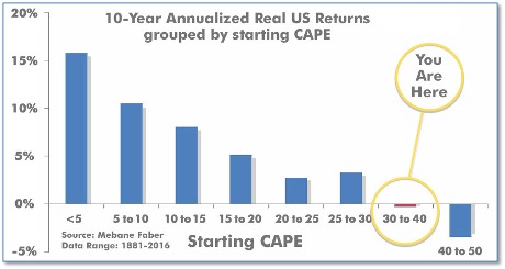 The long-term valuation of the market is commonly measured by the Cyclically Adjusted Price to Earnings ratio, or “CAPE”, which smooths-out shorter-term earnings swings in order to get a longer-term assessment of market valuation. A CAPE level of 30 is considered to be the upper end of the normal range, and the level at which further PE-ratio expansion comes to a halt (meaning that further increases in market prices only occur as a general response to earnings increases, instead of rising “just because”). The market was recently at that level.